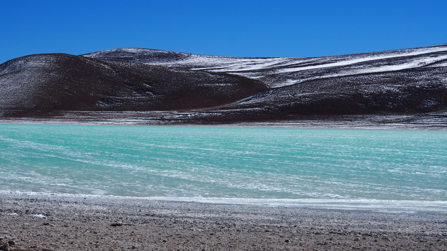 Die Höhe ist immer noch unser Hauptthema und deshalb sind wir etwas verärgert, als der chilenische Grenzbeamte uns nach Erhalt des Ausreisestempels gar nicht losfahren lassen will: Es wäre noch nicht klar, ob die Straße morgen befahrbar wäre und es wäre sehr kalt – ach nee, das wissen wir bereits. Das mit der Straße natürlich nicht. Also übernachten wir nochmal notgedrungen in San Pedro de Atacama auf 2600 Höhenmetern, was unser ganzes Höhentraining und unsere Akklimatisation wieder zusammenschrumpfen lässt, die Lagunenroute, die vor uns liegt, liegt weitgehend auf 4400m. Über sie wird viel spekuliert. Durch den Schneefall der letzten Tage kann keiner so genau sagen, ob die Straße nun matschig ist, oder ob der Schnee vielleicht sogar die eine oder andere Passage erleichtert. Die wilden Theorien nehmen am Morgen ein Ende, wir dürfen endlich losfahren und uns selber ein Bild machen. Auf nach Bolivien! Direkt nach der Grenze liegt bereits die erste Lagune der Route: Laguna Verde, sie ist irre schön und durch den umliegenden Schnee märchenhaft bezaubernd. Die Pisten sind knackig angefroren und dadurch gut befahrbar – ich glaube, Heinz hat Spaß an der Offroad Strecke – mir macht es nicht so viel Spaß, wenn ich darüber nachdenke, dass diese Strecke 450km so sein wird. Gerade will ich richtig loszaudern, als zwei Fahrradfahrer auf uns zurollen, Schweizer, wie sich herausstellt, die ganz im Glück sind, diese heftige Strecke so gut und so lebendig gemeistert zu haben – mir bleibt der Zauder im Halse stecken! Ich muss mich nicht beschweren! Die beiden haben nur Fahrräder und ein Zelt….. . Wieder befriedeter lasse ich mich durch die Landschaft ruckeln, bis wir zum Übernachtungsplatz kommen, zu den heißen QuellenThermas de Polques.